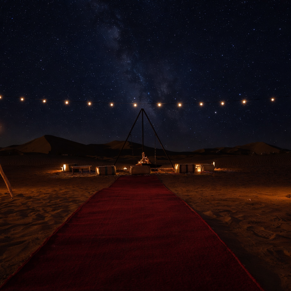 Para llegar al campamento vivirás un paseo en dromedario, una forma única de sentir el desierto en estado puro y conectar con su ritmo y su silencio. Una vez allí, disfrutarás de una cena típica bereber, elaborada con recetas tradicionales, y de un delicioso desayuno al amanecer entre las dunas.