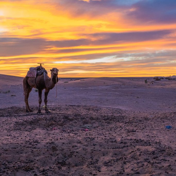 Paseo en dromedario al atardecer, cruzando las dunas mientras el sol tiñe el desierto de tonos dorados y rojizos.
