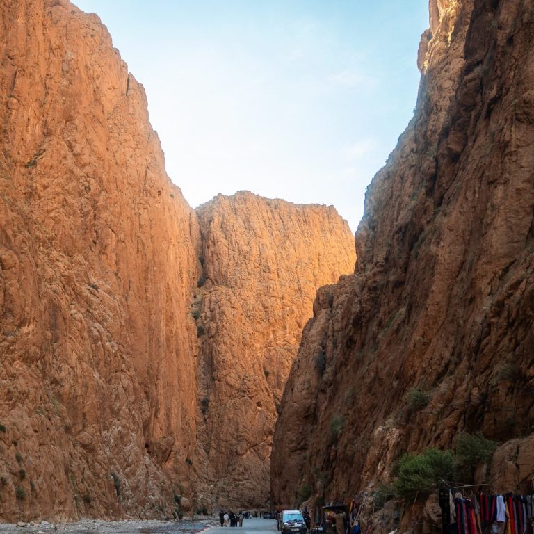 En las Gargantas del Todra, las paredes de piedra se elevan gigantes. El viento suena entre las rocas.